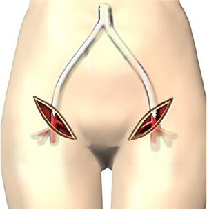 • Aorto-bifemoral bypass:   is performed when both iliac arteries are affected. A Y-shaped graft is used to connect the aorta to both femoral arteries.